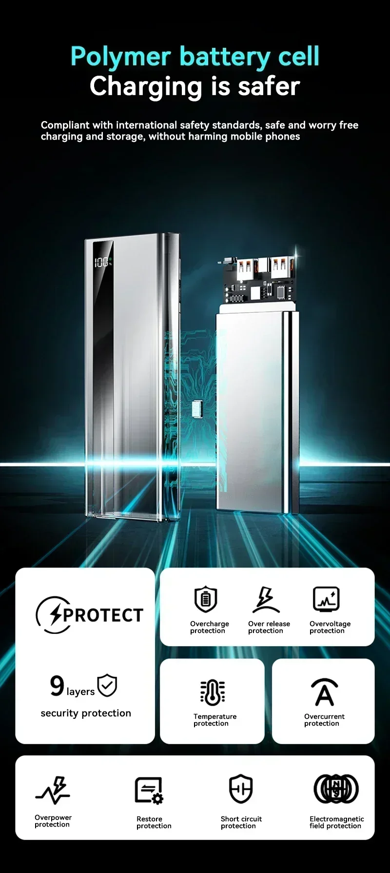 Built in intelligent chip, providing comprehensive protection such as overvoltage, overcurrent, overcharge, short circuit, temperature control, etc., to safeguard your device and power bank itself.