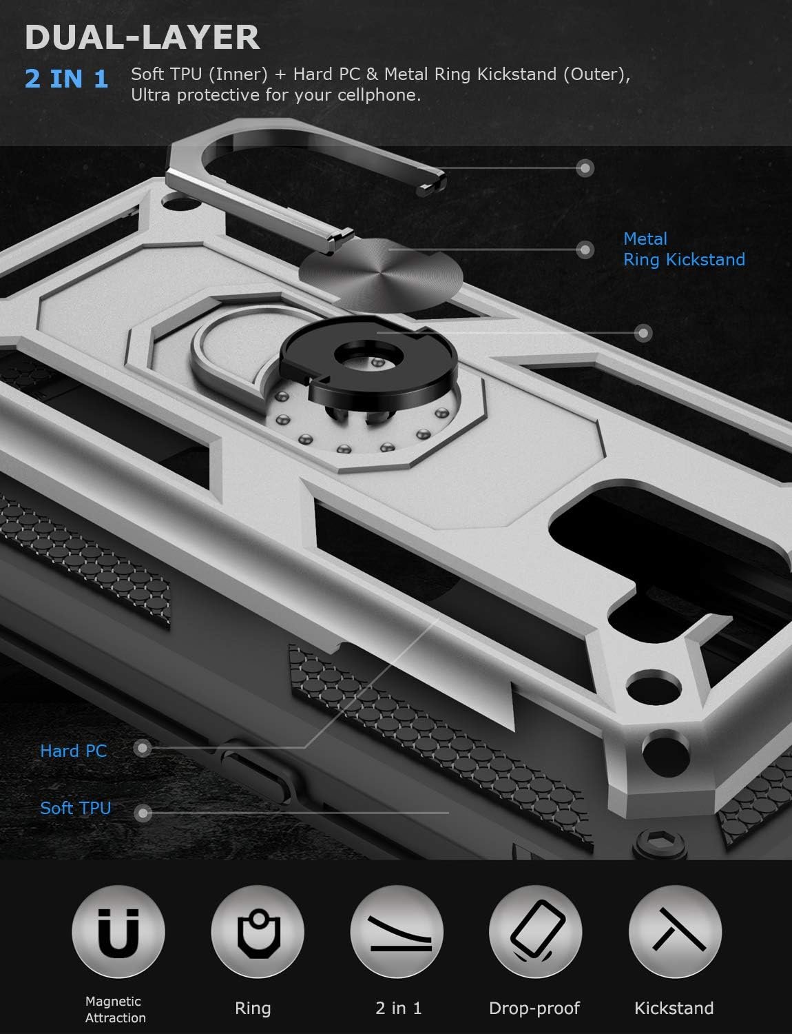 [ 2 In 1 Design ] This phone case is perfectly designed with Hard PC + Soft TPU, that is heavy duty and provides double protection,protects the cellphone more effectively from the impact of accidental drop.